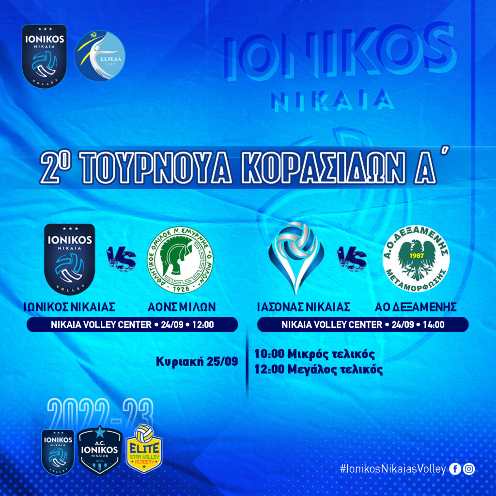 Το πρόγραμμα του τουρνουά περιλαμβάνει τις πάρα κάτω αναμετρήσεις: Σάββατο 24/09/2022 • 12:00 ΙΩΝΙΚΟΣ ΝΙΚΑΙΑΣ – ΑΟΝΣ ΜΙΛΩΝ • 14:00 ΙΑΣΟΝΑΣ ΝΙΚΑΙΑΣ – ΑΟ ΔΕΞΑΜΕΝΗΣ Κυριακή 25/09/2022 • 10:00 ΜΙΚΡΟΣ ΤΕΛΙΚΟΣ • 12:00 ΜΕΓΑΛΟΣ ΤΕΛΙΚΟΣ