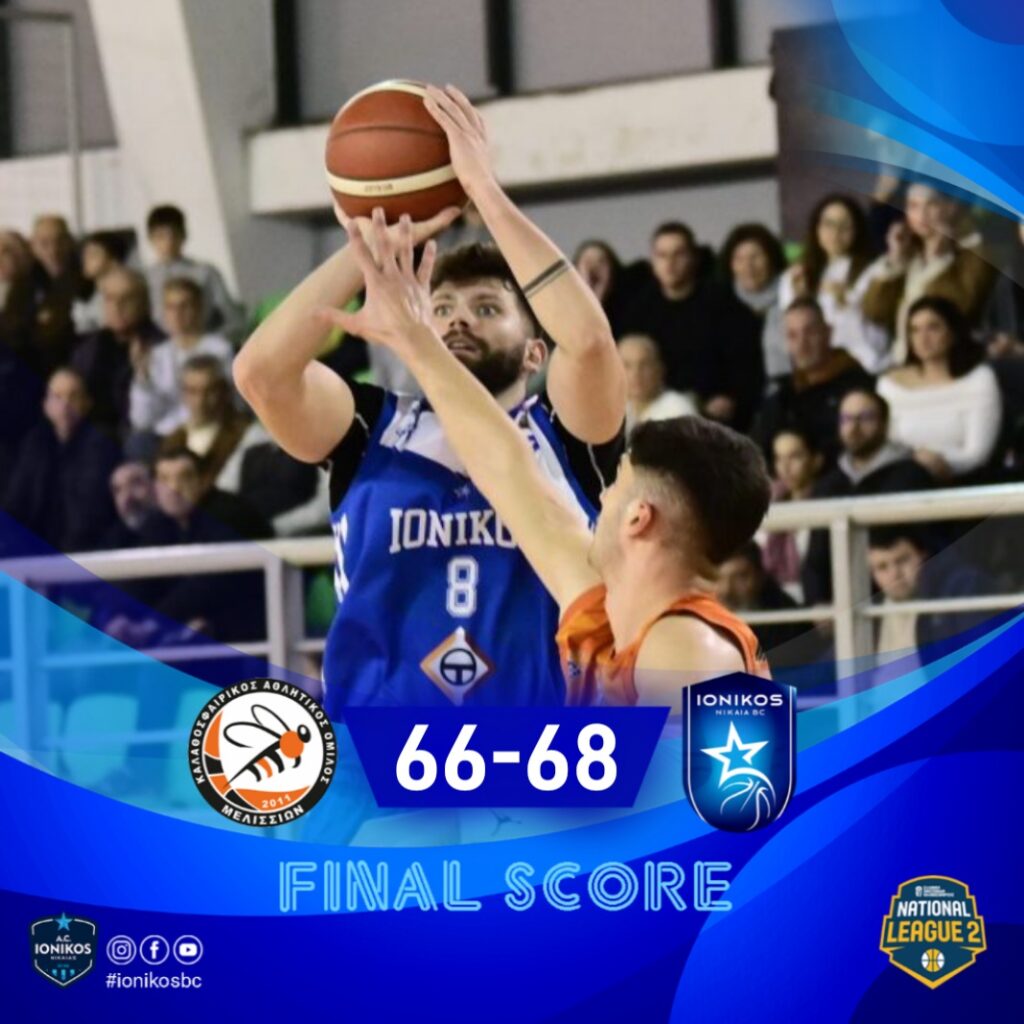 ✅ Στην τελευταία περίοδο, το παιχνίδι πήρε μια άγρια ομορφιά, με τους γηπεδούχους να πιέζουν περισσότερο και με την εμπειρία του Μαυροειδή, να βρίσκουν σκορ. Έτσι, μείωσαν σε 51-55 με τον Ιωνικό, χάρη στον εξαιρετικό Μαλτέσιο να κρατά με νύχια και με δόντια το προβάδισμα (58-62). 2’ πριν το τέλος του παιχνιδιού, τα Μελίσσια μετά από συνεχή αντεπίθεση, ξαναπήραν το προβάδισμα (65-64). Ο Ιωνικός ωστόσο ανταπεξήλθε. Ο Ντακούλιας έκανε καθοριστικό κλέψιμο, δίνοντας έτοιμο καλάθι στο Ζαραϊδώνη ο οποίος και ξαναέδωσε προβάδισμα στην ομάδα του (65-66). Στην επόμενη φάση, δόθηκε φάουλ υπέρ των Μελισσίων με τον προπονητή του Ιωνικού να διαμαρτύρεται έντονα με αποτέλεσμα να δεχθεί τεχνική ποινή. Ωστόσο, τα Μελίσσια μετουσίωσαν σε πόντο μόνον τη βολή της τεχνικής ποινής, αστοχώντας στις δύο βολές του φάουλ και με το σκορ να παραμένει στο 66-66. 45’’ πριν το τέλος, ο Ιωνικός κέρδισε φάουλ με τον Μαλτέσιο να είναι ψύχραιμος, γράφοντας το 66-68 από τη γραμμή της φιλανθρωπίας. Από εκεί και πέρα, ο Ιωνικός ναι μεν δε βρήκε άλλο σκορ αλλά απ’ την άλλη, τα Μελίσσια, αφενός με βήματα στην κατοχή κι αφετέρου, στην τελευταία τους ευκαιρία, έβγαλαν τη μπάλα εκτός αγωνιστικού μετά από πολύ καλή άμυνα του Λεκάκη, 1’’ πριν το τέλος. Το παιχνίδι ολοκληρώθηκε με τελικό σκορ 66-68.