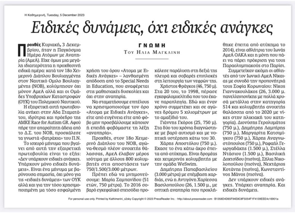Το αφιέρωμα της καθημερινής για την ημέρα της αναπηρίας του Ηλία Μαγκλίνη. Ευχαριστούμε πολύ για την αναφορά στην ομάδα μας που για πρώτη φορά συμμετείχε με τόσο πολλούς αθλητές σε ανοικτή θάλασσα. Μπράβο σε όλους μας τους αθλητές που συμμετείχαν επάξια με θάρρος και αξιοπρέπεια.
