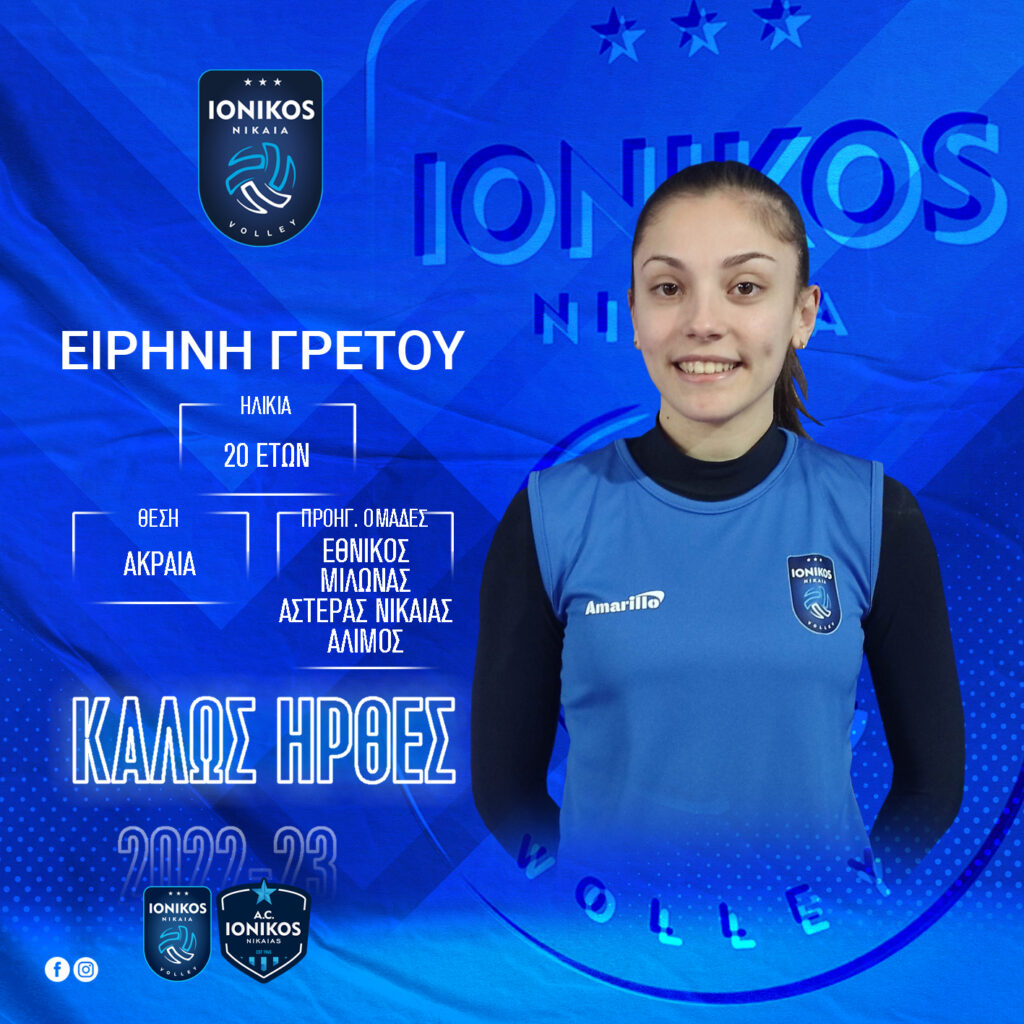 Καλωσορίζουμε ένα γνώριμο πρόσωπο στα γήπεδα μας,την Ειρήνη Γρετού, που έχει ξαναπεράσει τις πόρτες του 1ου κλειστού γυμναστηρίου Νίκαιας αγωνιζόμενη με την φανέλα του Αστέρα Νίκαιας.