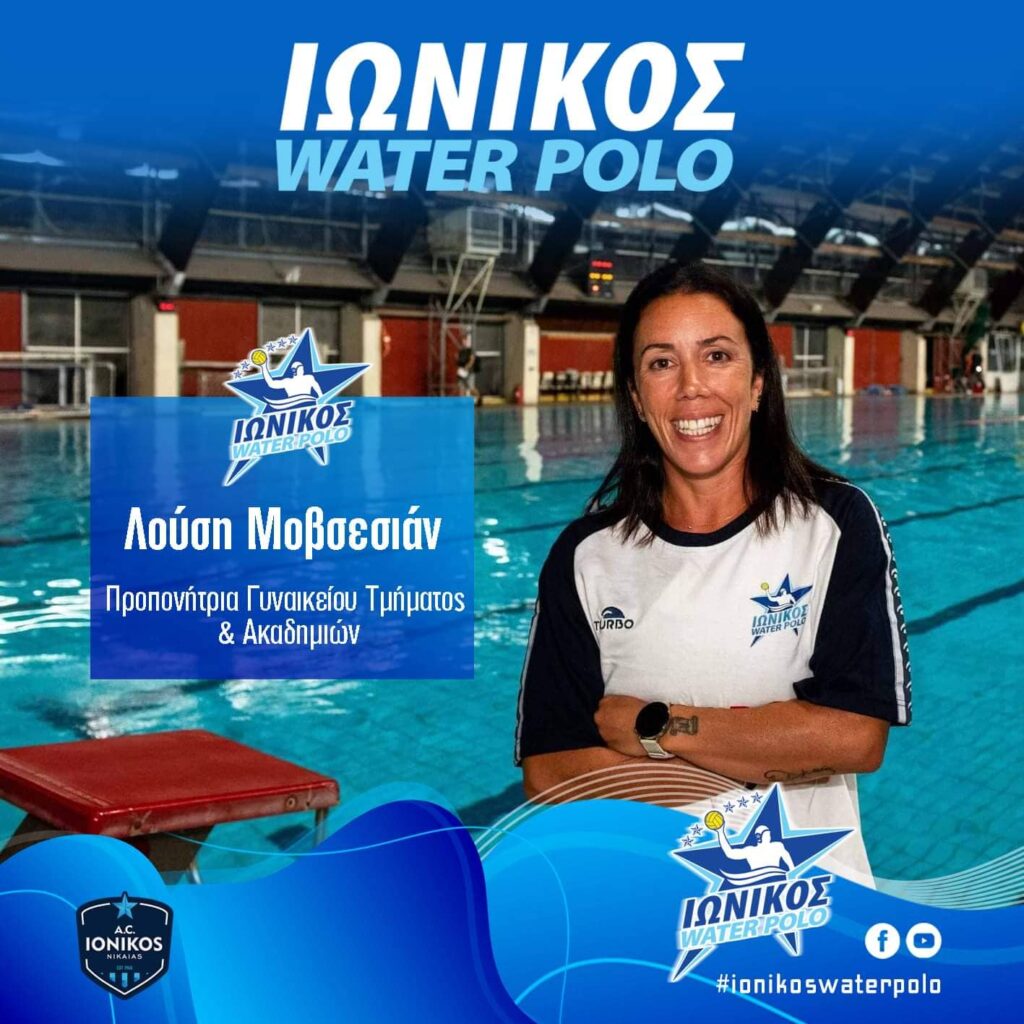 Το τμήμα υδατοσφαίρισης του Ιωνικού Νίκαιας βρίσκεται στην ευχάριστη θέση να ανακοινώσει την αναβάθμιση της Λούση Μοβσεσιάν ως προπονήτριας του Γυναικείου τμήματος παραμένοντας παράλληλα και προπονήτρια στις Ακαδημίες. Αποτελεί ιδιαίτερη χαρά καθώς ξεκίνησε και έμαθε τα μυστικά του αθλήματος στον Ιωνικό στον οποίο επέστρεψε πέρσι ως προπονήτρια στα αγωνιστικά τμήματα των Ακαδημιών και χάρη στη δουλειά της και την αγάπη της για το άθλημα, θεωρήθηκε η κατάλληλη προκειμένου να πραγματωθεί καλύτερα η φιλοσοφία μας. Έναν Ιωνικό που θα βασίζεται κυρίως στα «παιδιά» του τα οποία και θα επανδρώνουν τις ομάδες Ανδρών και Γυναικών.