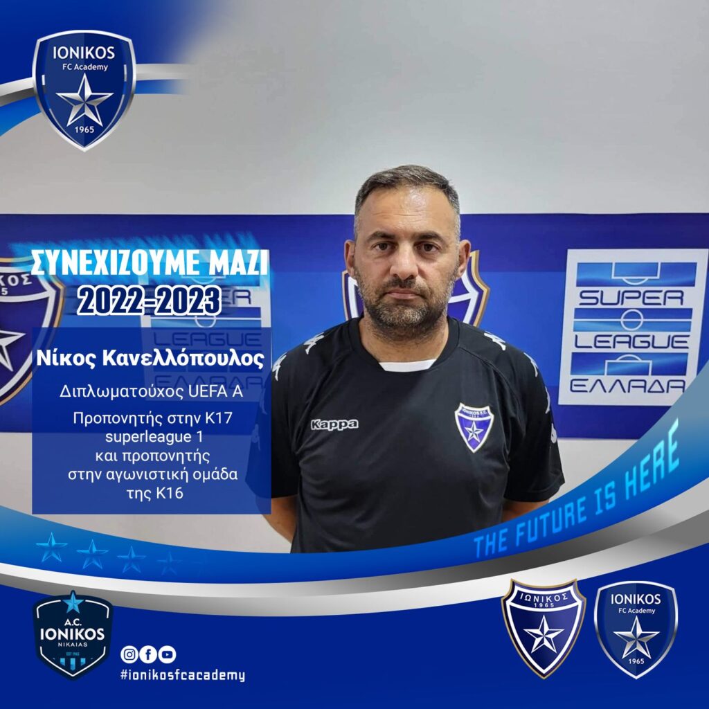 Η Διοίκηση Ακαδημιών του Ιωνικού Νικαίας, ανακοινώνει την ανανέωση της συνεργασίας της με τον προπονητή της Κ17 Superleague 1, Κανελλόπουλο Νίκο ,ο οποίος μέχρι πρότινος ήταν ο προπονητής της Κ16. Του ευχόμαστε καλή επιτυχία στο δύσκολο αυτό έργο που έχει αναλάβει.