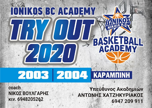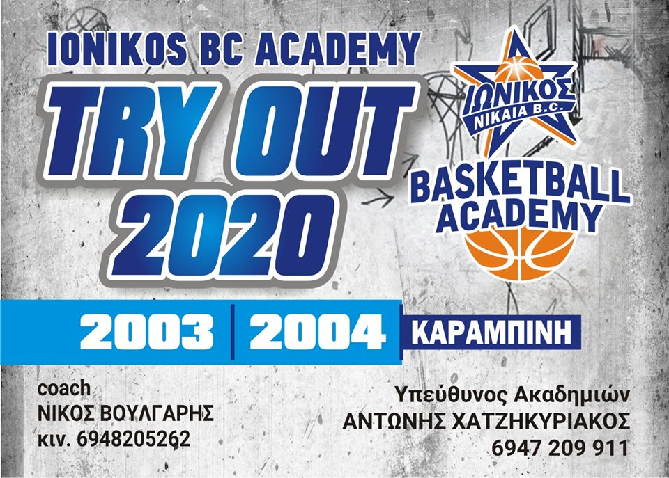 Η IONIKOS NIKAIAS BC Academy ενημερώνει ότι θα πραγματοποιηθούν ανοιχτές προπονήσεις (TRY OUT) για όσους αθλητές επιθυμούν να δοκιμαστούν και να ενταχθούν στα τμήματά της, για την αγωνιστική περίοδο 2020-21.
