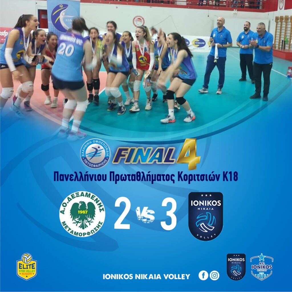 Ανατροπή “ψυχής” για τα κορίτσια του Ιωνικού Νίκαιας (Κ18) τα οποία μετά από ένα συγκλονιστικό αγώνα volley στην τελική φάση του Πανελλήνιου Πρωταθλήματος Κορασίδων (Κ18), νίκησαν την πολύ καλή γηπεδούχο ομάδα της Δεξαμενής Μεταμόρφωσης – η οποία φιλοξενεί το τουρνουά της τελικής φάσης, στο σούπερ ντέρμπυ της 2ης αγωνιστικής με 3-2 σετ, ανατρέποντας το 0-2 σετ που διαμορφώθηκε στην εξέλιξη του αγώνα.