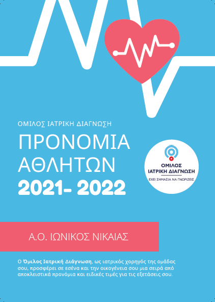Η συνεργασία του Ερασιτέχνη Ιωνικού με τον Όμιλο Ιατρική Διάγνωση απευθύνεται σε όλα τα τμήματα του συλλόγου καθώς και σε όλα τα μέλη του Ερασιτέχνη παρέχοντας εξετάσεις σε προνομιακές τιμές με έκπτωση 50% είτε ιδιωτικά είτε επί της συμμετοχής του ασφαλισμένου.