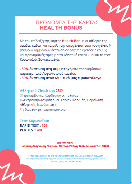 Παράλληλα διενεργείται πλήρης καρδιολογικός έλεγχος (Ηλεκτροκαρδιογράφημα, Τρίπλεξ Καρδιάς) για την έκδοση των δελτίων των αθλητών μας σε εξαιρετικά προνομιακές τιμές!