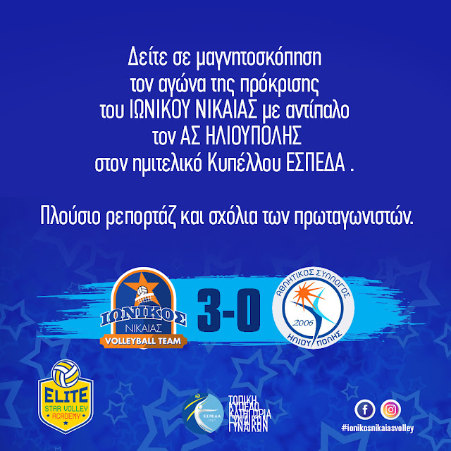 Δείτε τον αγώνα – πρόκριση του Ιωνικού Νίκαιας στην επόμενη φάση με το ΑΣ Ηλιούπολης ο οποίος για πρώτη φορά από την επαναλειτουργία του τμήματος volley έφερε την ομάδα στην ημιτελική φάση του θεσμού του Κυπέλλου ΕΣΠΕΔΑ.