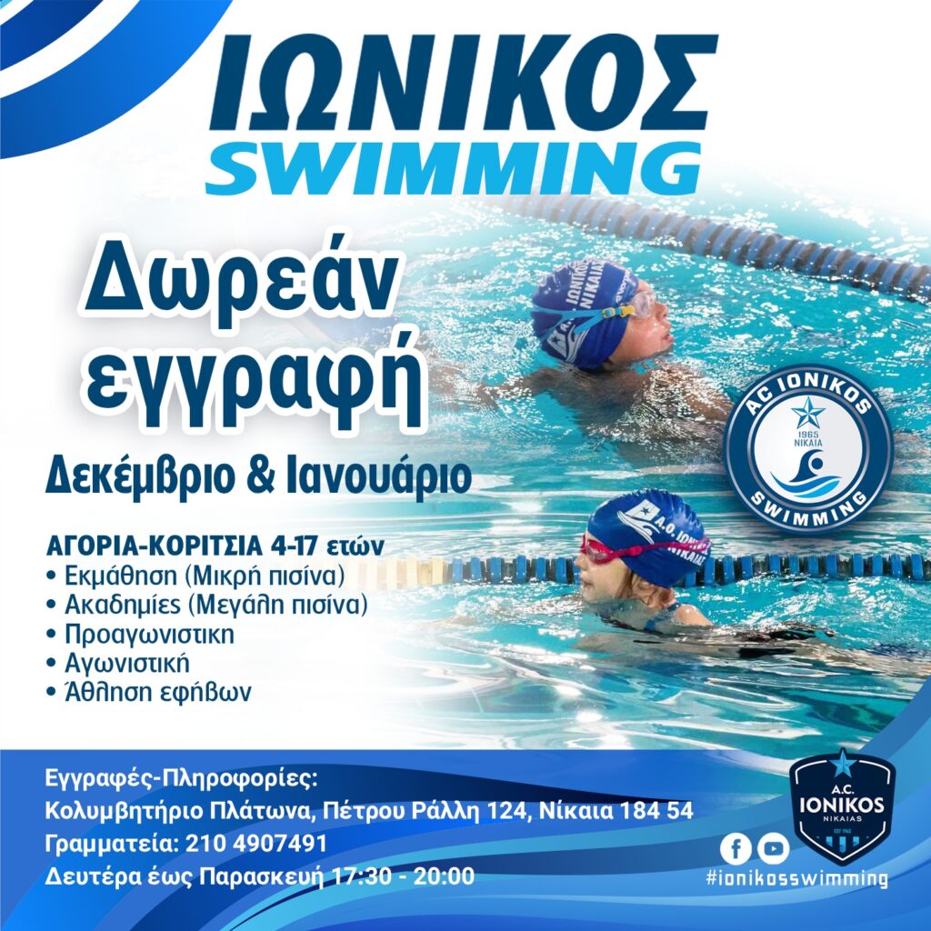 Οι εγγραφές στο τμήμα κολύμβησης συνεχίζονται κανονικά. Για τους μήνες Δεκέμβριο και Ιανουάριο σας προσφέρουμε την εγγραφή σας εντελώς δωρεάν!