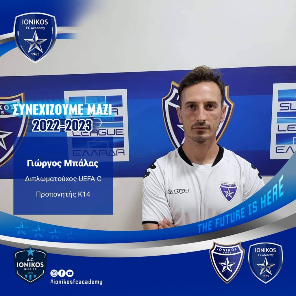 Η Διοίκηση Ακαδημιών του Ιωνικού Νικαίας ανακοινώνει την έναρξη της συνεργασίας της με τον νέο προπονητή της Κ 14 Μπάλα Γιώργο, κάτοχο διπλώματος UEFA C, όπως και στην Εφαρμογή νέων τεχνολογιών και μεθόδων στη βιντεοανάλυση για την αξιολόγηση της ανάλυσης απόδοσης (performance analysis) των ποδοσφαιριστών ΤΕΦΑΑ Αριστοτελείου Πανεπιστημίου Θεσσαλονίκης (ΑΠΘ) Τον καλωσορίζει και του εύχεται καλή επιτυχία στο δύσκολο αυτό έργο που έχει αναλάβει!