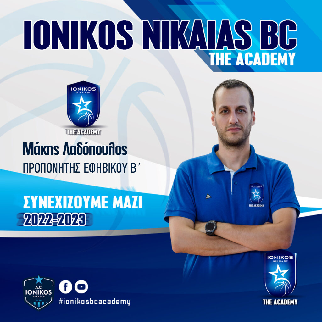 Ο Α.Ο. Ιωνικός Νικαίας βρίσκεται στην ευχάριστη θέση να ανακοινώσει την επέκταση της συνεργασίας του με τον προπονητή των Ακαδημιών, Μάκη Λαδόπουλο. Ο κ.Λαδόπουλος βρίσκεται στην Ακαδημία μπάσκετ του συλλόγου μας τα τελευταία χρόνια έχοντας συμβάλει σημαντικά στην εξέλιξη των αθλητών μας.