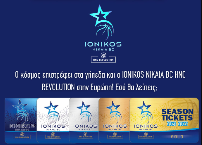 Απευθείας ηλεκτρονική αγορά μέσω της ιστοσελίδας της VIVA στον παρακάτω σύνδεσμο (ισχύει για τις κατηγορίες White, Bronze και Silver): https://www.viva.gr/tickets/festival/sports/ionikos-nikaia-bc-hnc-revolution-eisitiria-diarkeias-2021/2022/ Από το κλειστό του Πλάτωνα (ισχύει για όλες τις κατηγορίες): Δευτέρα μέχρι Παρασκευή 16.00 – 19.00 *Απαραίτητη η επίδειξη αστυνομικής ταυτότητας και το ΑΜΚΑ. Δικαίωμα αγοράς εισιτηρίου διαρκείας έχουν όλοι, αλλά δικαίωμα εισόδου στο γήπεδο έχουν όσοι διαθέτουν πιστοποιητικό εμβολιασμού για τον Covid-19 ή νόσησης.