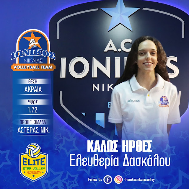 Η Διοίκηση του τμήματος volley του Ιωνικού Νίκαιας και της Ακαδημίας Elite Star Volley Academy ανακοινώνει την έναρξη της συνεργασίας του με την αθλήτρια Ελευθερία ΔΑΣΚΑΛΟΥ.