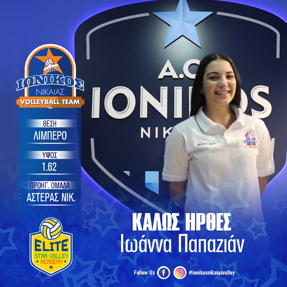 Η Διοίκηση του τμήματος volley του Ιωνικού Νίκαιας και της Ακαδημίας Elite Star Volley Academy ανακοινώνει την έναρξη της συνεργασίας του με την αθλήτρια Ιωάννα ΠΑΠΑΖΙΑΝ.