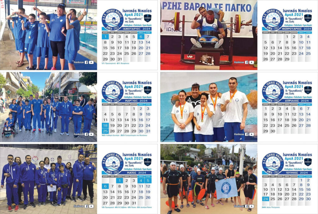 Ο ΙΩΝΙΚΟΣ ΝΙΚΑΙΑΣ ΑμεΑ με μεγάλη περηφάνια παρουσιάζει το πρώτο του ημερολόγιο με κάποιες από τις σημαντικότερες επιτυχίες των αθλητών του συλλόγου μας. Το ημερολόγιο κοστίζει 10€ και τα έσοδα θα διατεθούν στο ταξίδι των αθλητών κολύμβησης για την συμμετοχή τους στην ΔΙΕΘΝΗ Συνάντηση κολύμβησης ‘’ΦΙΛΙΠΠΕΙΑ’’ που θα διεξαχθεί στην Θεσσαλονίκη 26-28 Ιανουαρίου.
