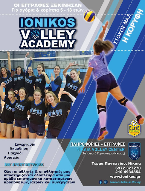 Από τη Δευτέρα 30/08 μπορείτε καθημερινά, από τις 17.00 έως τις 20.30 και Σάββατο από τις 10.00 έως τις 12.00, να πραγματοποιείτε τις προεγγραφές και εγγραφές για τη νέα χρονιά στη γραμματεία του Συλλόγου στο ΝΙΚΑΙΑ VOLLEY CENTER (1o Κλειστό Γυμναστήριο Νίκαιας – Τέρμα Παντειχίου & Ακροπόλεως, 210 4934854) καθώς και στην Υπεύθυνη της Ακαδημίας κα Αθηνά Γεωργοπούλου (6972 327270).