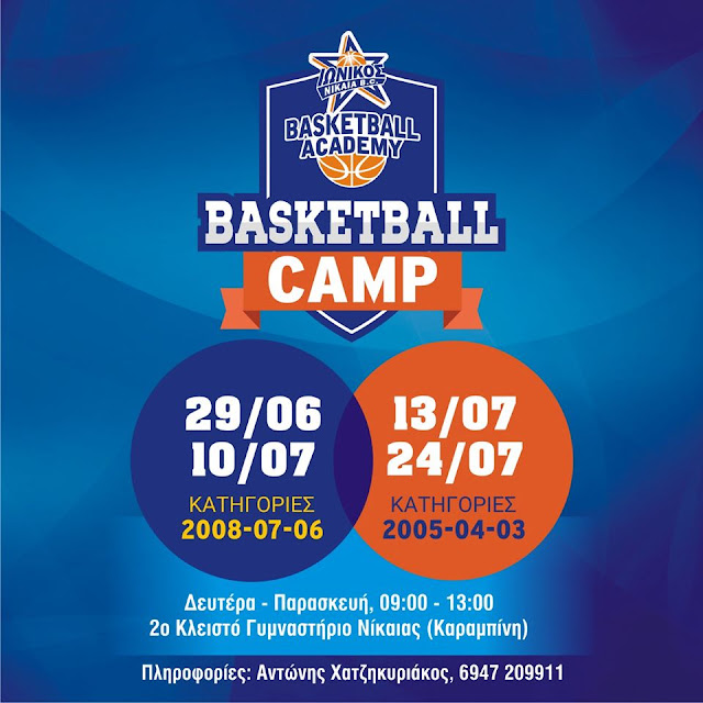Ο Ιωνικός Νίκαιας διοργανώνει ένα Καλοκαιρινό Camp με στόχο την ατομική βελτίωση των παιδιών. Το Camp θα πραγματοποιηθεί στο 2ο κλειστό γυμναστήριο της Νίκαιας (Καραμπίνη), σε 2 περιόδους: 1η περίοδος 29/06-10/07 για παιδιά γεννημένα 2008-07-06 και 2η περίοδος 13/07-24/07 για παιδιά γεννημένα 2005-04-03.
