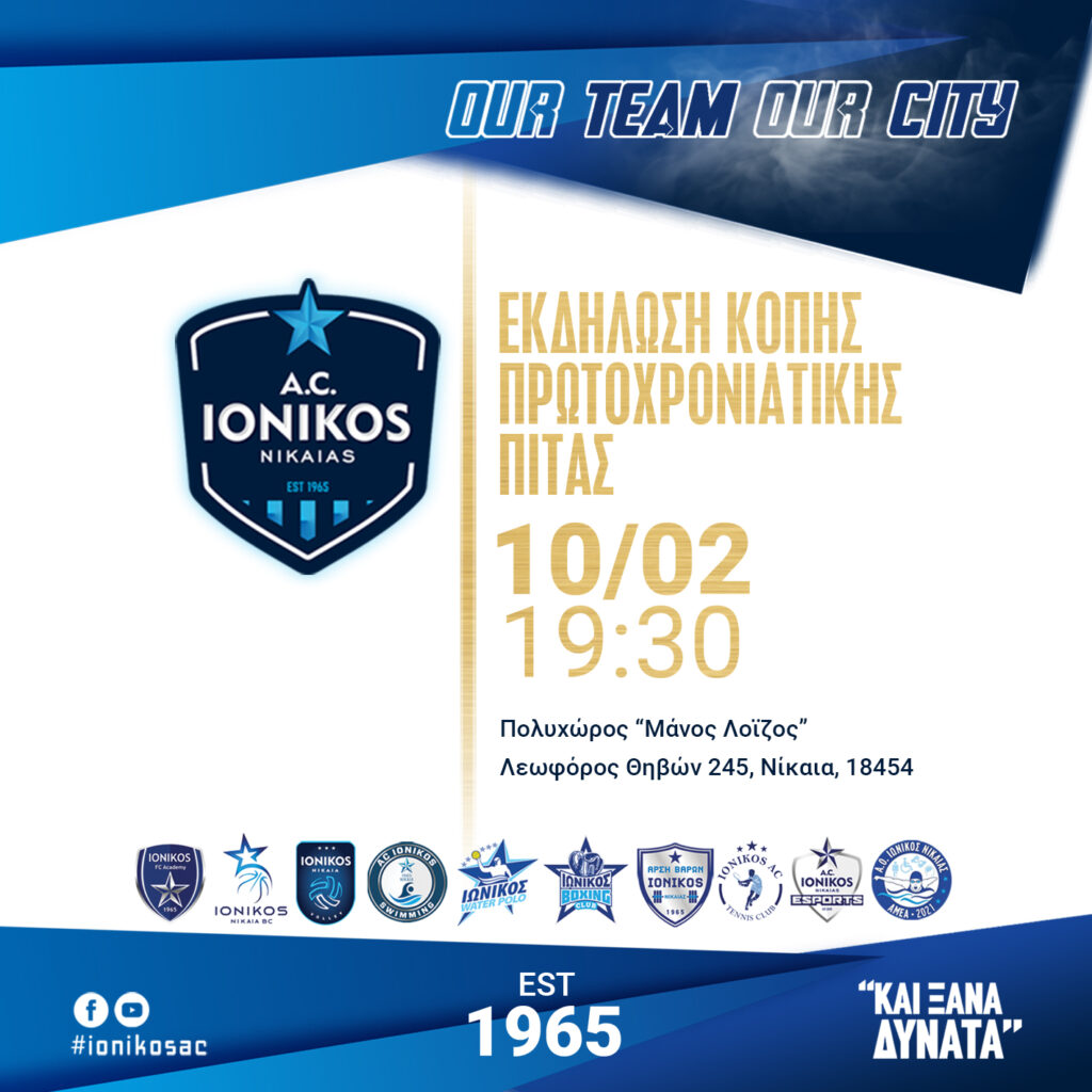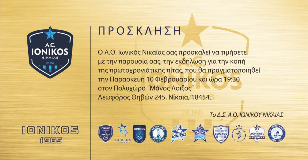 Έτσι λοιπόν, μετά από δύο χρόνια αναστολής λόγω COVID, σύσσωμος ο Α.Ο. Ιωνικός Νικαίας κόβει την πίτα του στις 10 Φεβρουαρίου στις 19.30 στο «Μάνος Λοΐζος». Είναι μάλιστα η πρώτη φορά μετά από αρκετά χρόνια ο Ιωνικός θα εμφανιστεί ως ενιαίος και αδιαίρετος καθώς τα προηγούμενα χρόνια, το κάθε τμήμα συνήθιζε να κόβει τη βασιλόπιτα, ξεχωριστά.