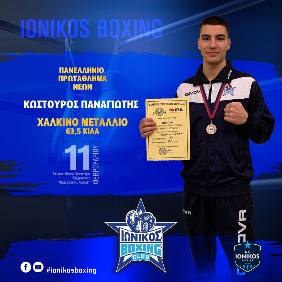 Με μια πλούσια αγωνιστική περίοδο με χρυσό στο Πανελλήνιο Πρωτάθλημα Παίδων 2021, χρυσό μετάλλιο σε διεθνή συμμετοχή ήρθε η κατάκτηση της 3ης θέσης στο πανελλήνιο πρωτάθλημα ΝΕΩΝ 2022 στην κατηγορία των 63,5κ. Σ έναν πολύ δυνατό αγώνα που κρίθηκε στις λεπτομέρειες . Ο Παναγιώτης είναι ένας ταλαντούχος πυγμάχος που με την αγωνιστικότητα του μόνο διακρίσεις μπορεί να έχει.