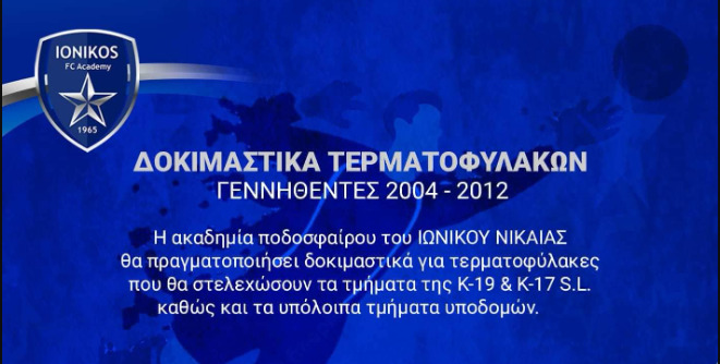 Η Aκαδημία Ποδοσφαίρου θα πραγματοποιήσει δοκιμαστικά για τερματοφύλακες που θα στελεχώσουν τα τμήματα της Κ-19 & Κ-17 S.L. καθώς και τα υπόλοιπα τμήματα υποδομών. Τα δοκιμαστικά θα διεξαχθούν στο γήπεδο “Π. Νικολαίδης” από 21 έως και 23 Ιουνίου 2022. Οι ενδιαφερόμενοι μπορούν να ενημερωθούν απ΄ τον υπεύθυνο της ακαδημίας κ. Παπαναστασίου Παναγιώτη τηλ. 6932437410, την γραμματεία τηλ. 2117500044 (16.00 – 20.00μ.μ.) ή τον προπονητή τερ/κων κ. Κρούπη Γεώργιο τηλ. 6976015165