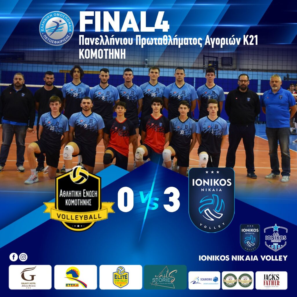 Με το δεξί ξεκίνησε στην τελική φάση του Πανελλήνιου πρωταθλήματος αγοριών Κ21 ο Ιωνικός Νίκαιας με αντίπαλο την ΑΕ Κομοτηνής! Η ομάδα μας ήταν καλύτερη σε όλο το παιχνίδι και επιβλήθηκε με 3-0 σετ. Μπράβο στα παιδιά και στον προπονητή!