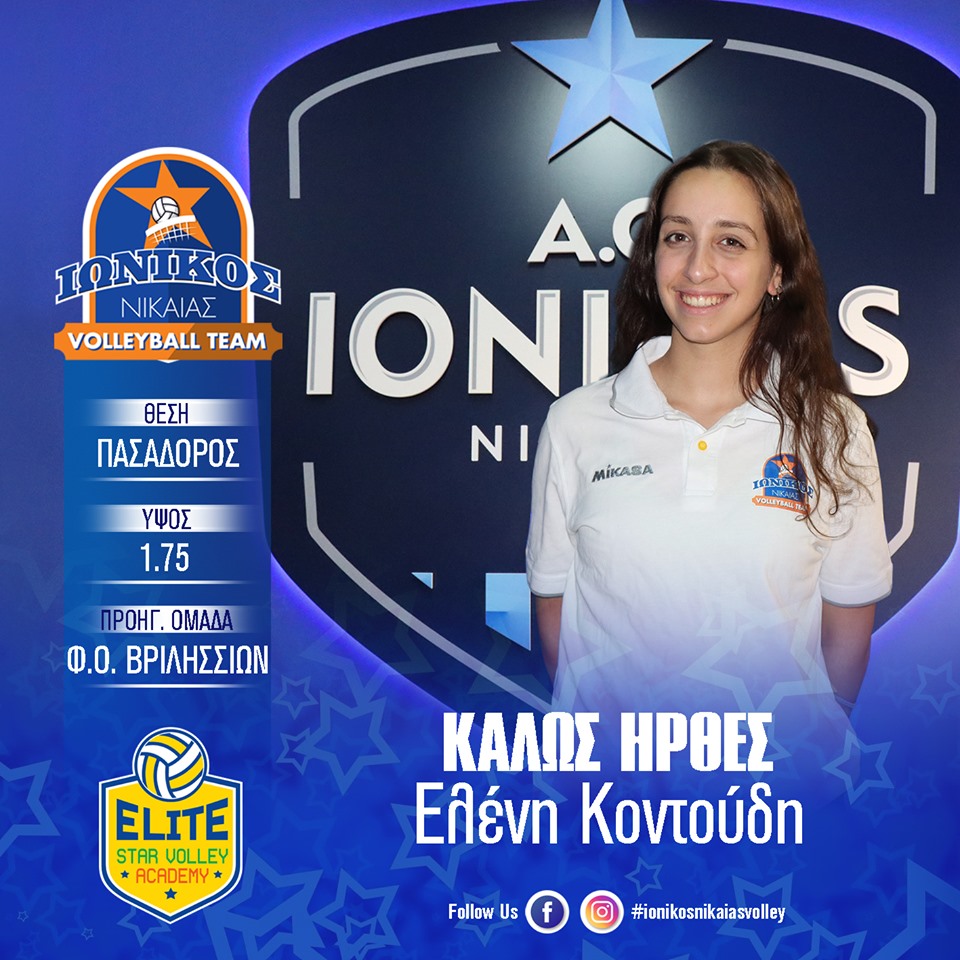 Η Διοίκηση του τμήματος volley του Ιωνικού Νίκαιας και της Ακαδημίας Elite Star Volley Academy ολοκληρώνοντας τον κύκλο μετεγγραφών και ανανεώσεων για την επόμενη αγωνιστική περίοδο, ανακοινώνει την έναρξη της συνεργασίας του με την αθλήτρια Ελένη ΚΟΝΤΟΥΔΗ.