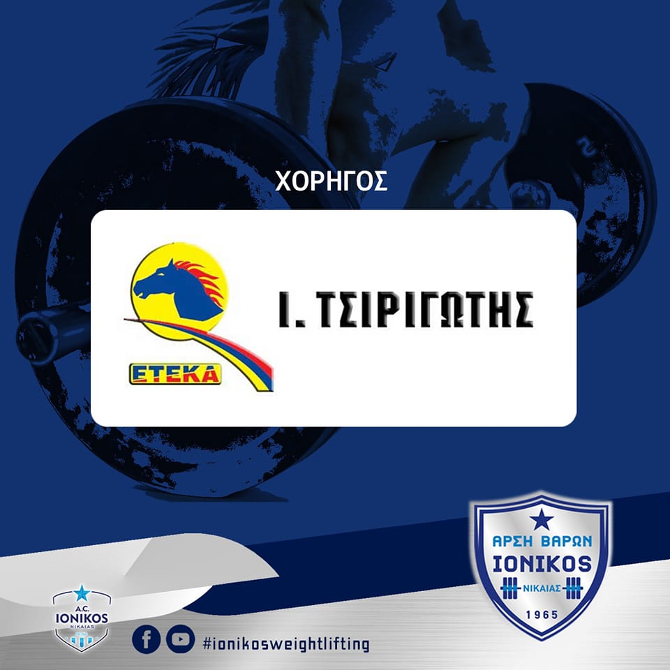 Η Άρση Βαρών καθώς και η Διοίκηση του ερασιτέχνη Ιωνικού εκφράζουν τις θερμές ευχαριστίες τους προς την οικογένεια Τσιριγώτη και τα πρατήρια υγρών καυσίμων «ΕΤΕΚΑ Ι. ΤΣΙΡΙΓΩΤΗΣ» για την χορηγία τους στο τμήμα της Άρσης Βαρών. Η χορηγία αφορά την ένδυση των αθλητών του τμήματός μας οι οποίοι το επόμενο διάστημα θα συμμετέχουν και στους αγώνες της ομοσπονδίας.