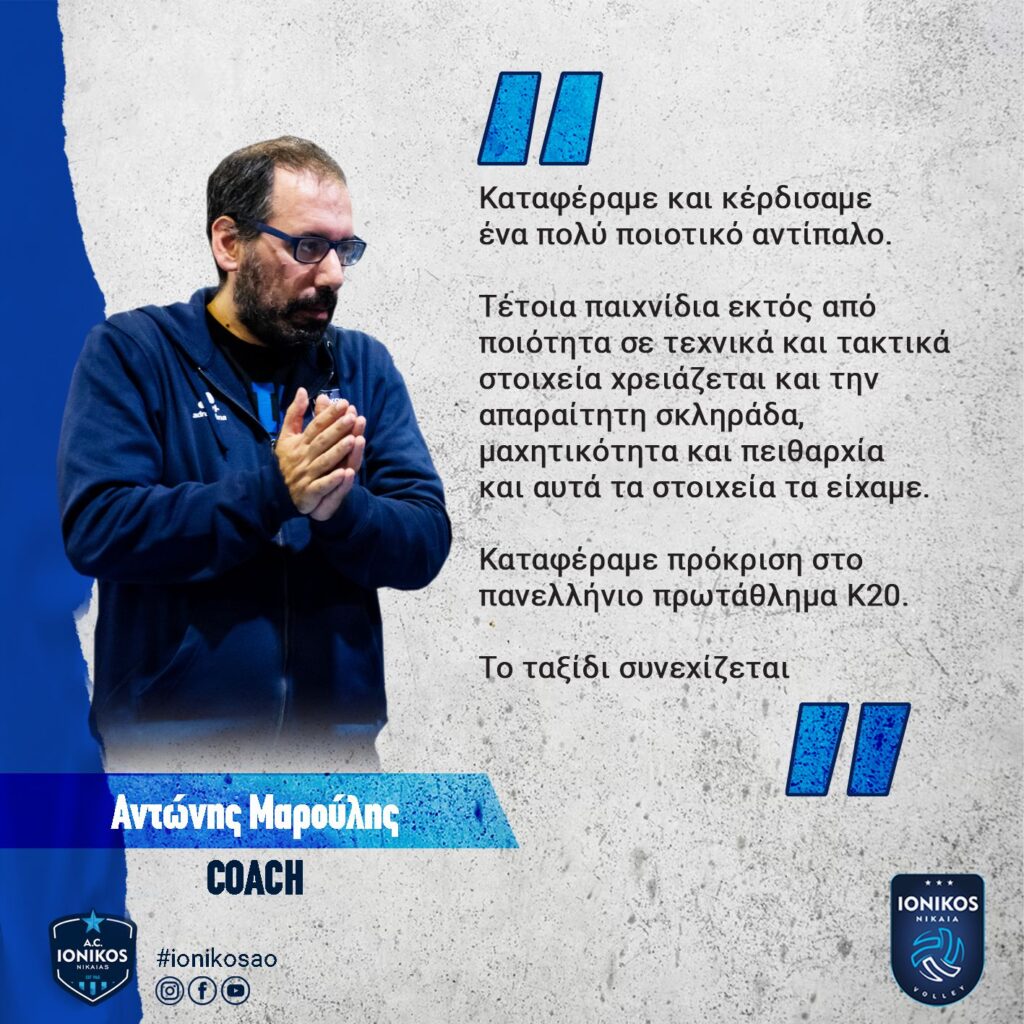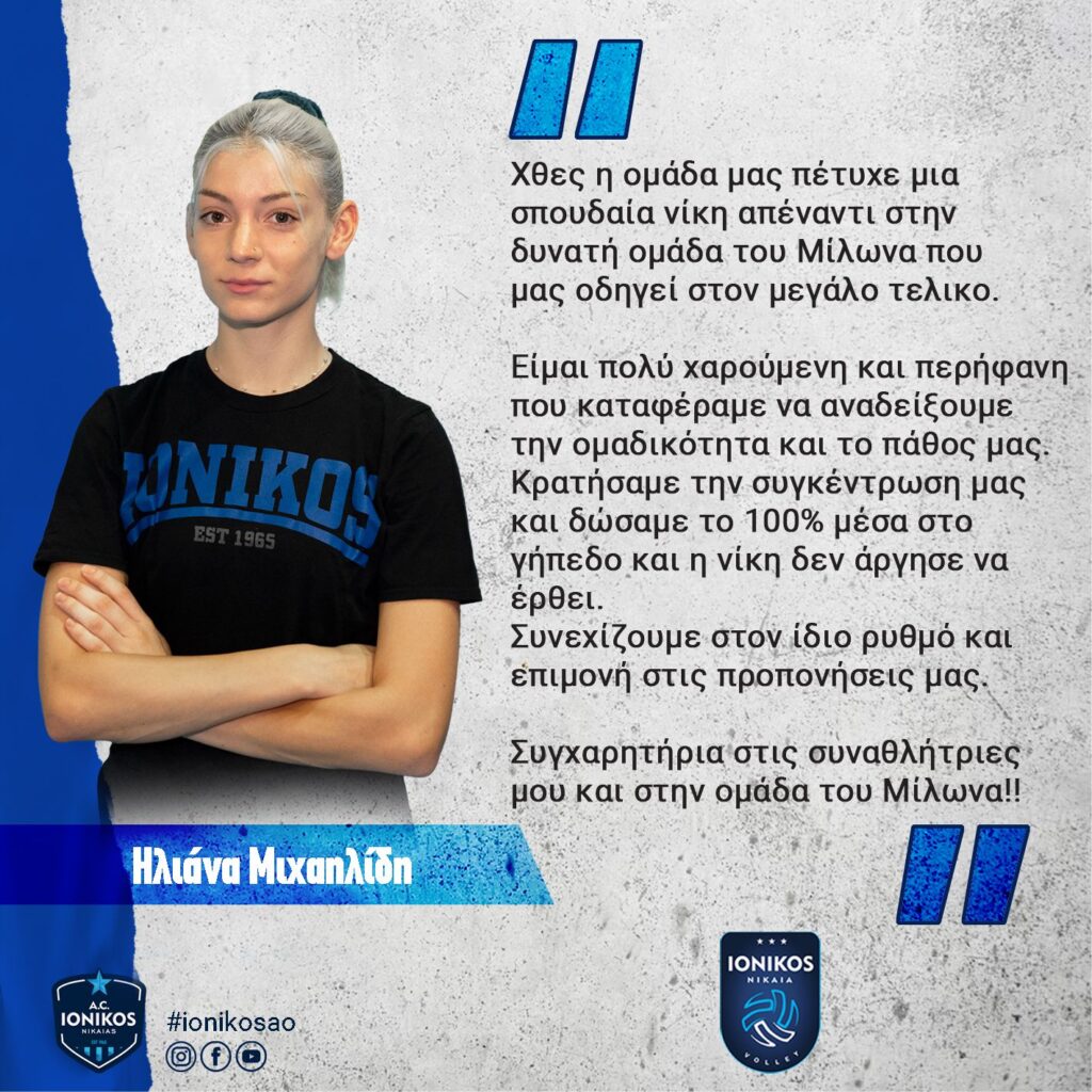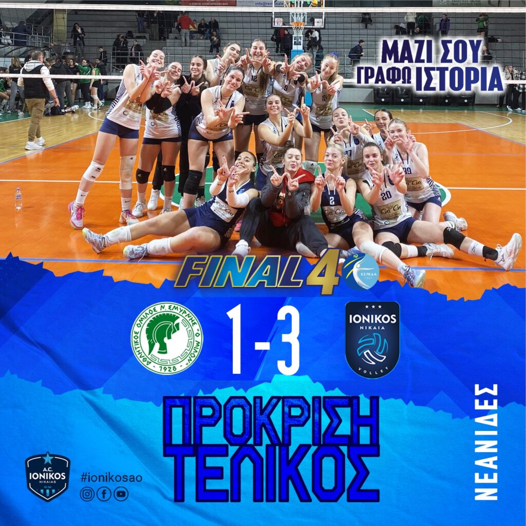 Το Δ.Σ του Ερασιτέχνη και η Διοικητική Επιτροπή του Τμήματος συγχαίρει τις Νεάνιδες μας για την Πρόκριση τους στον Τελικό καθώς και τον Προπονητή μας Αντώνη Μαρούλη για εξαιρετική δουλειά που έχει γίνει στο Τμήμα του Ιωνικού μας !! Μόνο περηφάνια μπορούμε να αισθανθούμε για όλους σας!