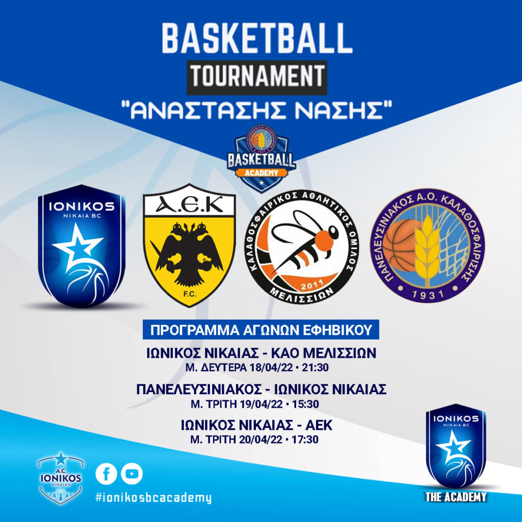 Ο Ιωνικός BC Academy βρίσκεται στην ευχάριστη θέση να ανακοινώσει, την συμμετοχή του εφηβικού του τμήματος στο Πασχαλινό Τουρνουά που διοργανώνει Πανελευσινιακός Αθλητικός Όμιλος Καλαθοσφαίρισης , στης 18, 19 και 20 Απριλίου στην πόλη της Ελευσίνας, στην μνήμη του αδικοχαμένου αθλητή Αναστάση Νάση.