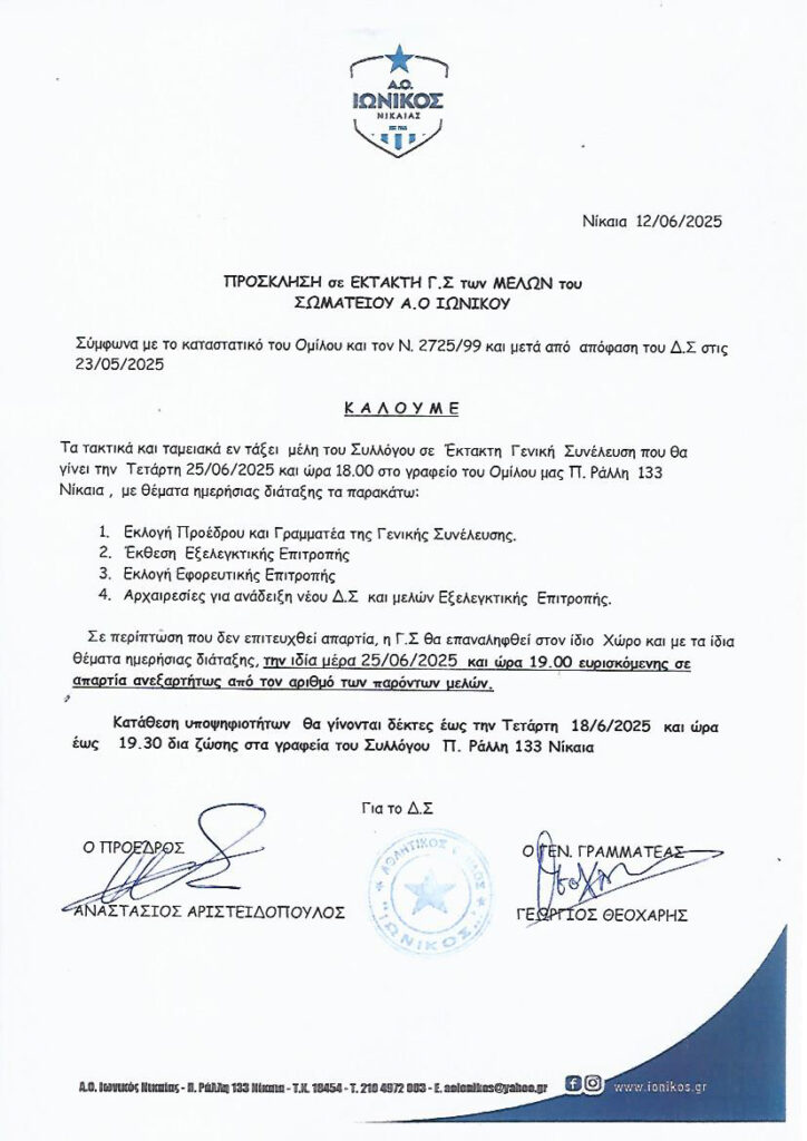 Κατάθεση υποψηφιοτήτων θα γίνονται δέκτες έως την Τετάρτη 18/6/2025 και ώρα έως 19.30 δια ζώσης στα γραφεία του Συλλόγου Π. Ράλλη 133 Νίκαια