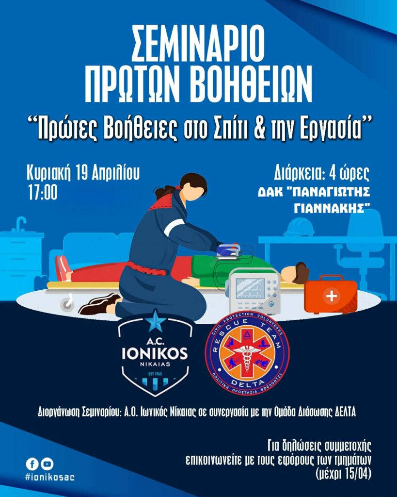 Ο Α.Ο. Ιωνικός Νικαίας σε συνεργασία με την εθελοντική, μη κυβερνητική – μη κερδοσκοπική οργάνωση RESCUE TEAM DELTA, διοργανώνει σεμινάριο πρώτων βοηθειών με τίτλο «Πρώτες Βοήθειες στο Σπίτι & την Εργασία».