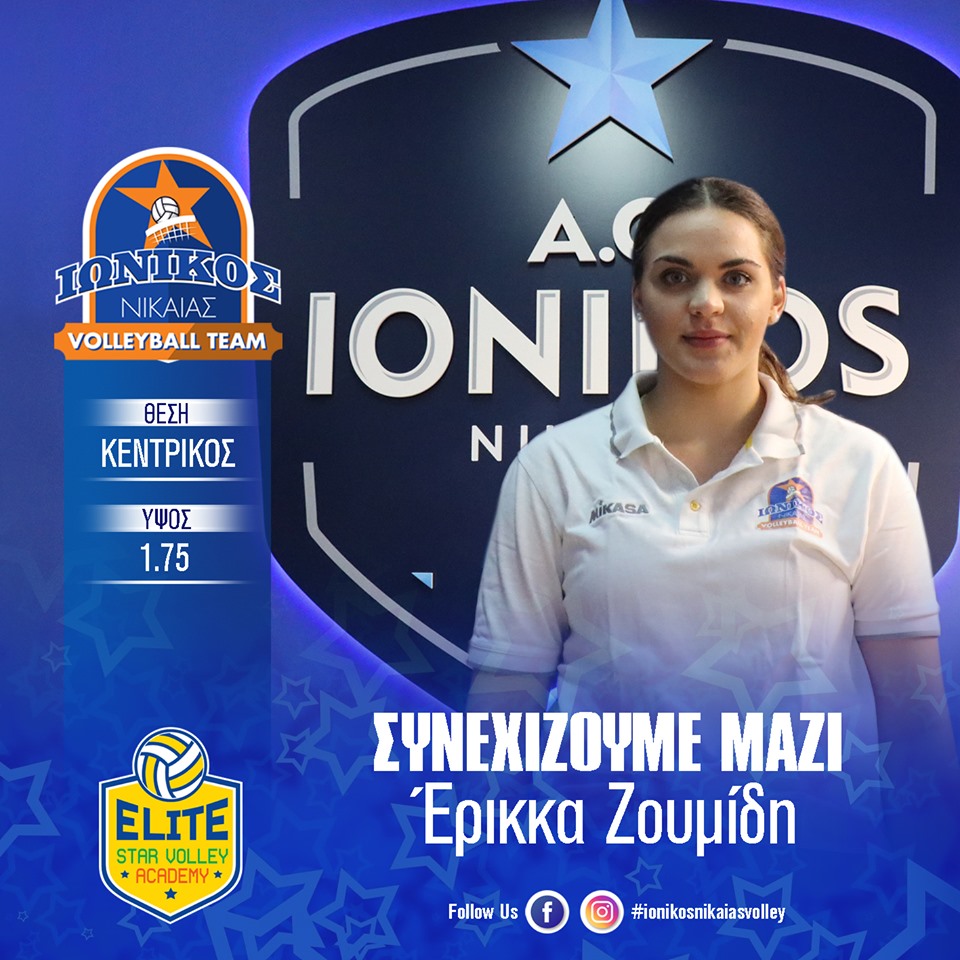 Η Διοίκηση του τμήματος volley του Ιωνικού Νίκαιας και της Ακαδημίας Elite Star Volley Academy ανακοινώνει την ανανέωση της συνεργασίας με την αθλήτρια Έρρικα ΖΟΥΜΙΔΗ.